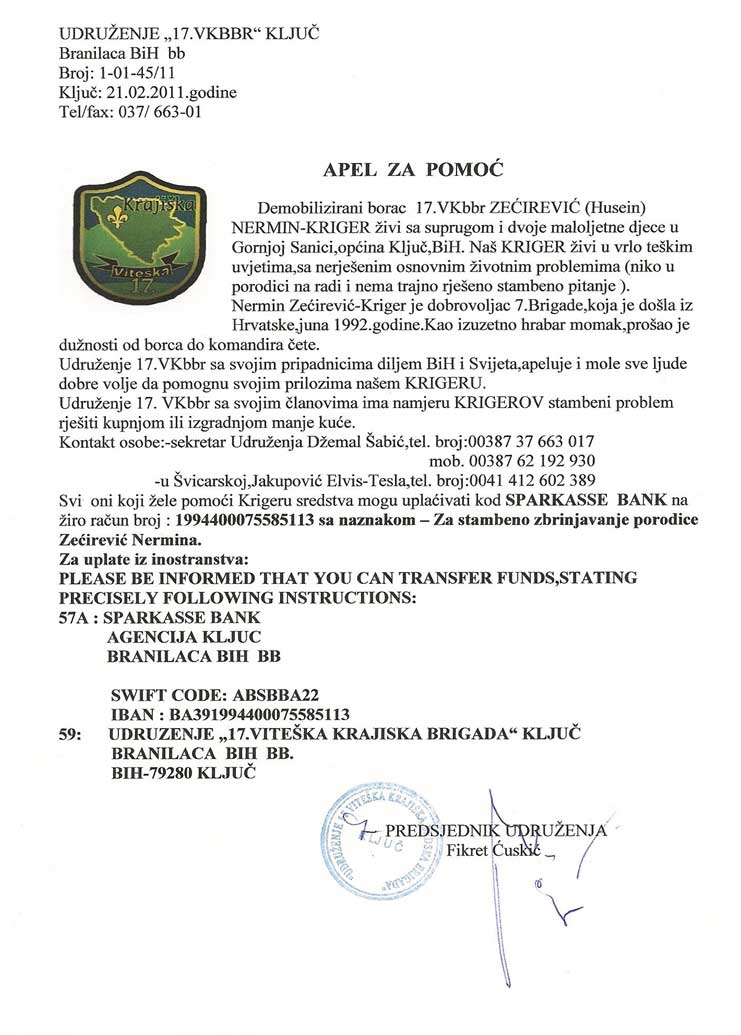 Obavještavaju se svi pripadnici boračkih populacija (Udruženje porodica šehida i poginulih boraca, Organizacija ratnih vojnih invalida i udruženje demobilisanih boraca) koji su zainteresirani za rješavanje svog stambenog pitanja, izgradnjom zgrade za boračke populacije, da se jave u kancelariju Udruženja porodica šehida i poginulih boraca u Ključu.