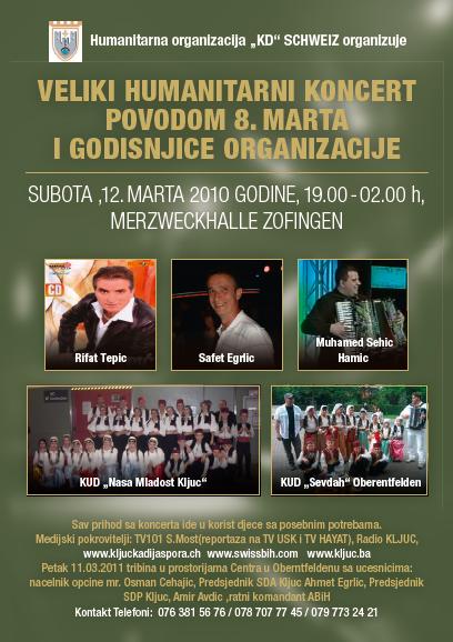Radi se o humanitarnom koncertu namijenjenom za Udruženje roditelja i djece sa posebnim potrebama u Ključu, a CH Udruženje ima namjeru sličnim aktivnostima obebjediti za djecu sa posebnim potrebama i vlastiti dom, namjenske prostorije koje biim omogućile nesmetano druženje i razvijanje. U Švicarskoj će prisustvovati i grupa novinara kolege iz sanske TV101 koji će uraditi reportažu te našeg radija. Pored koncerta koji je na programu 12. marta biće upriličeno i niz drugih kulturnih sadržaja.