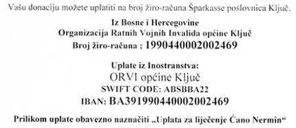 Organizacija ratnih vojnih invalida Općine Ključ poreknula je akciju prikupljanja pomoći za jednog svojeg člana kojemu je hitno potrebna operacija. Riječ je o Ćano Nerminu Njinji 60% ratnom vojnom invalidu čije je zdravstveno stanje naglo pogoršano, usljed posljedica ranjavanja u toku rata.